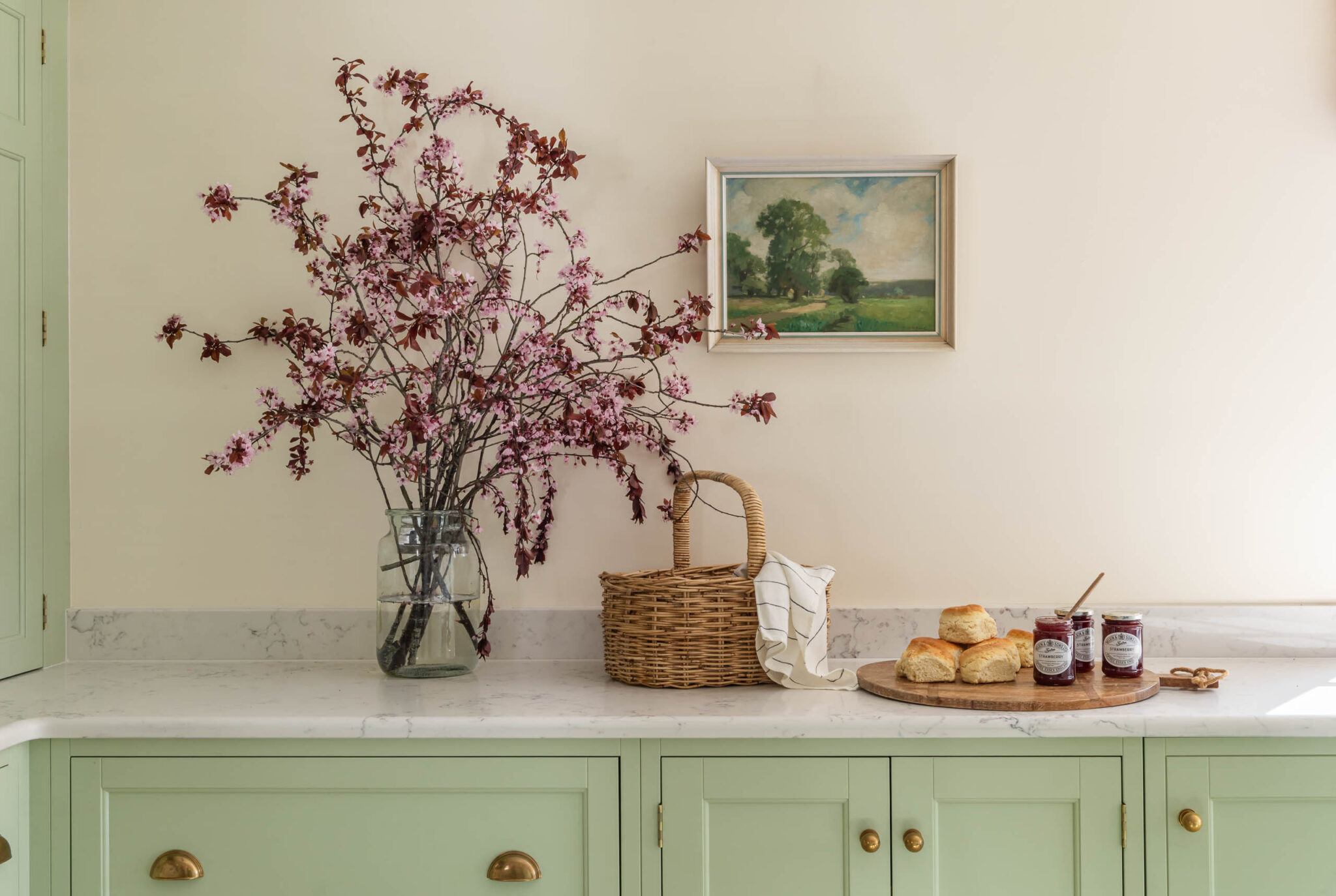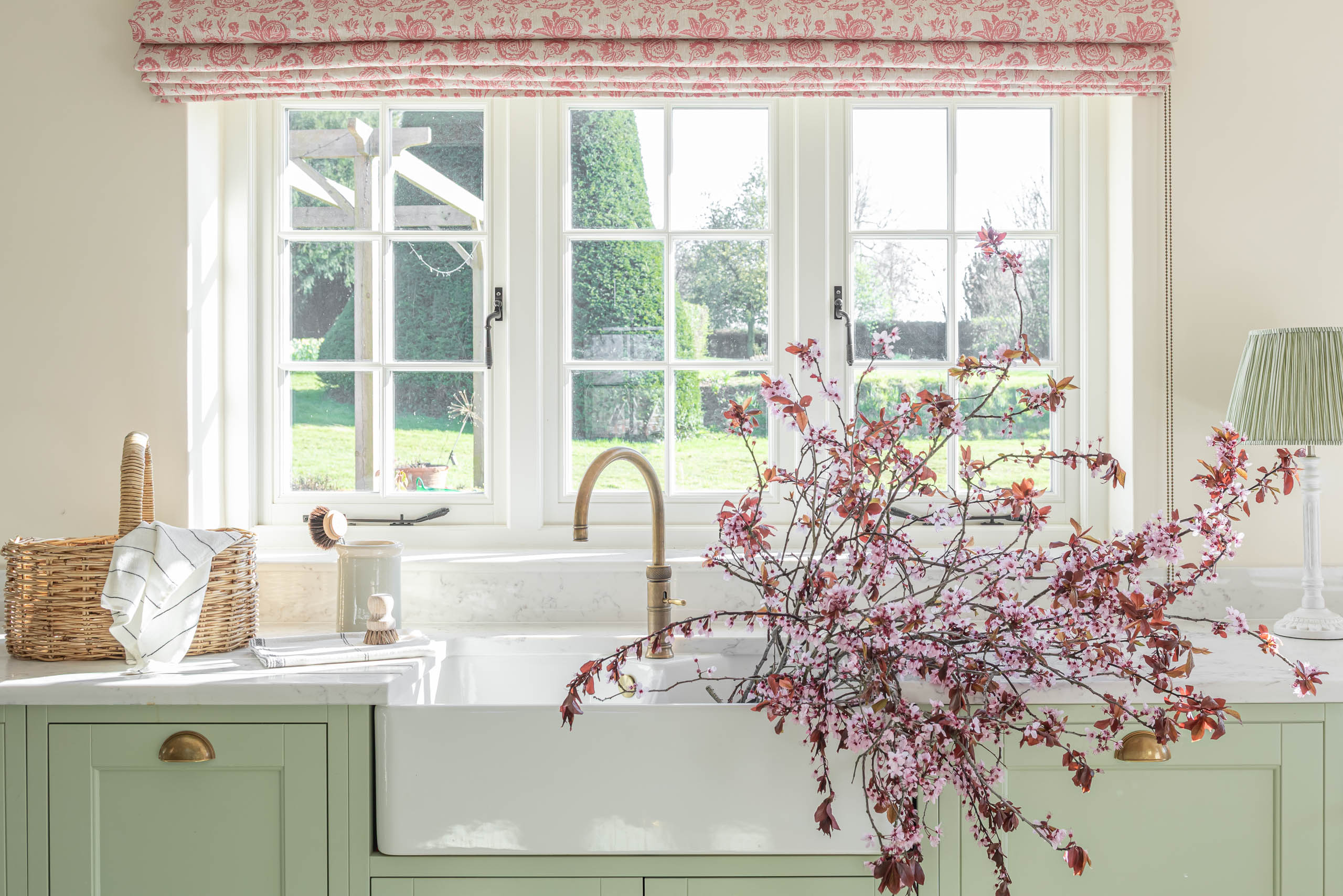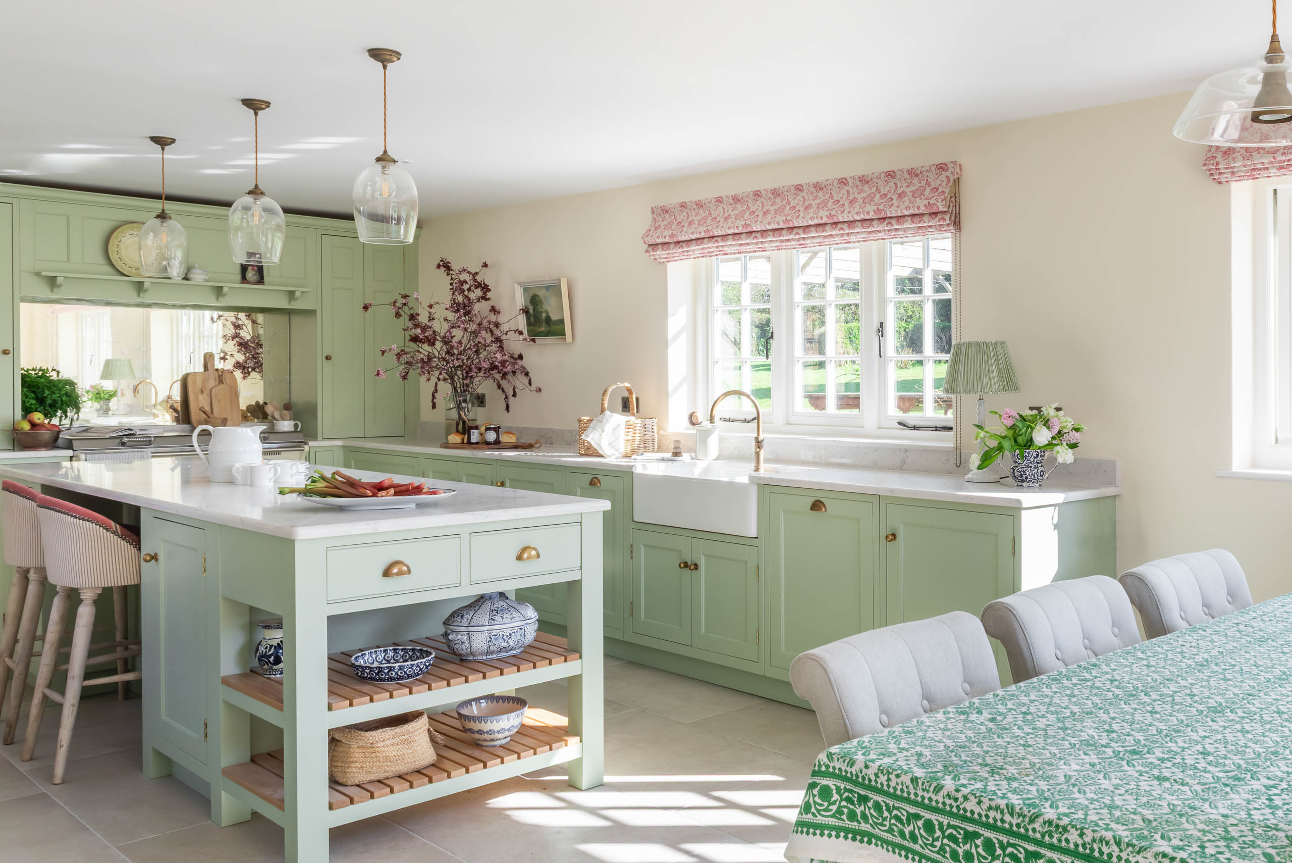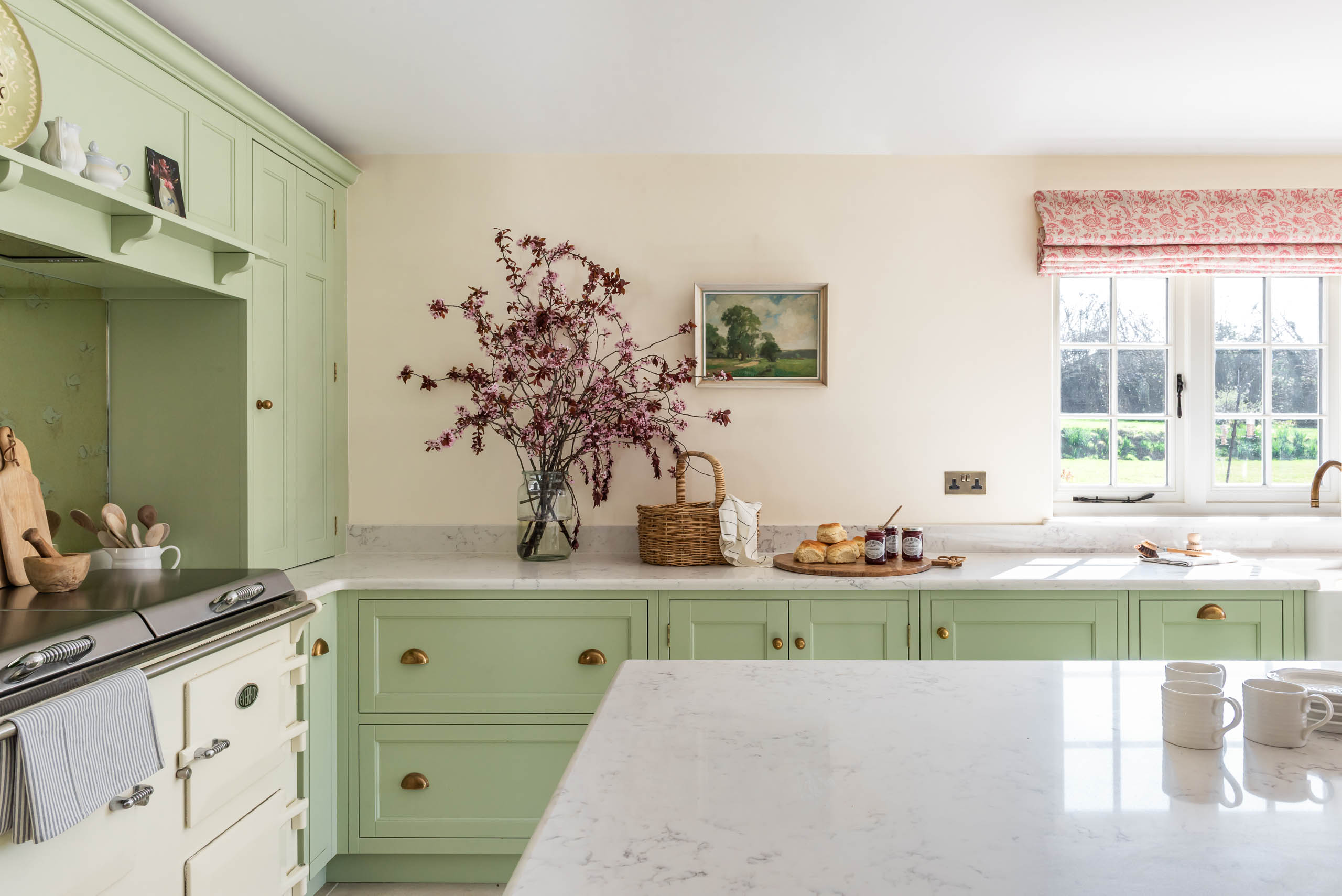Tận dụng triệt để ánh sáng tự nhiên từ cửa sổ khung gỗ, kết hợp với rèm Roman họa tiết hoa nhí để tăng thêm vẻ mềm mại. Sự đồng bộ giữa màu tủ bếp và tủ trưng bày (Dresser unit) tạo nên một ngôn ngữ thiết kế liền mạch. Tổng thể toát lên vẻ đẹp “quý tộc đồng quê” – thanh lịch, không phô trương nhưng đầy khí chất.