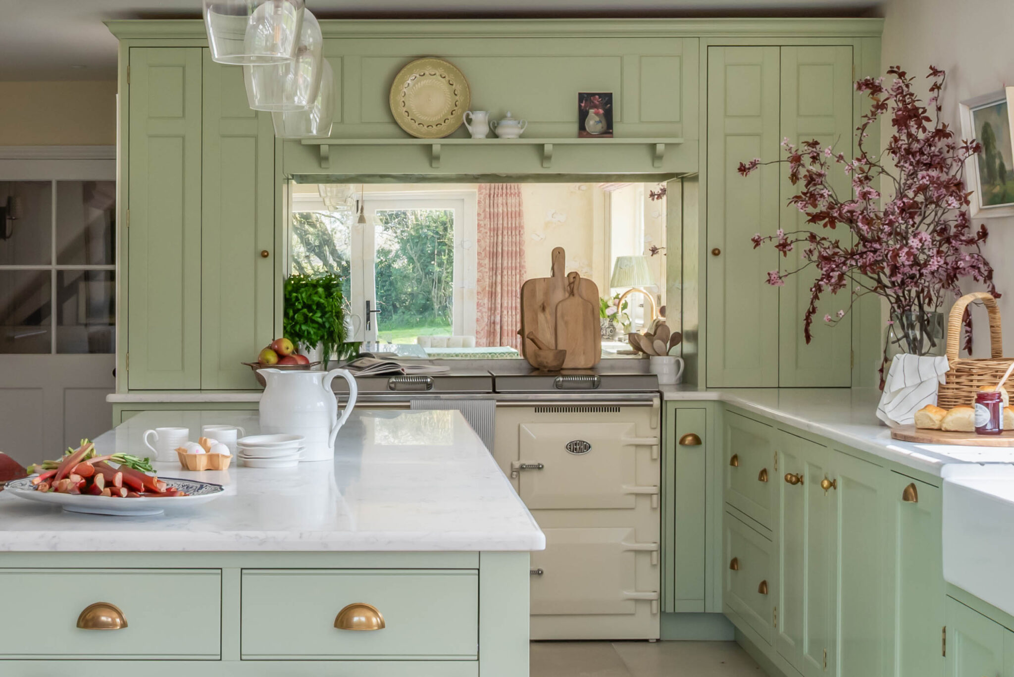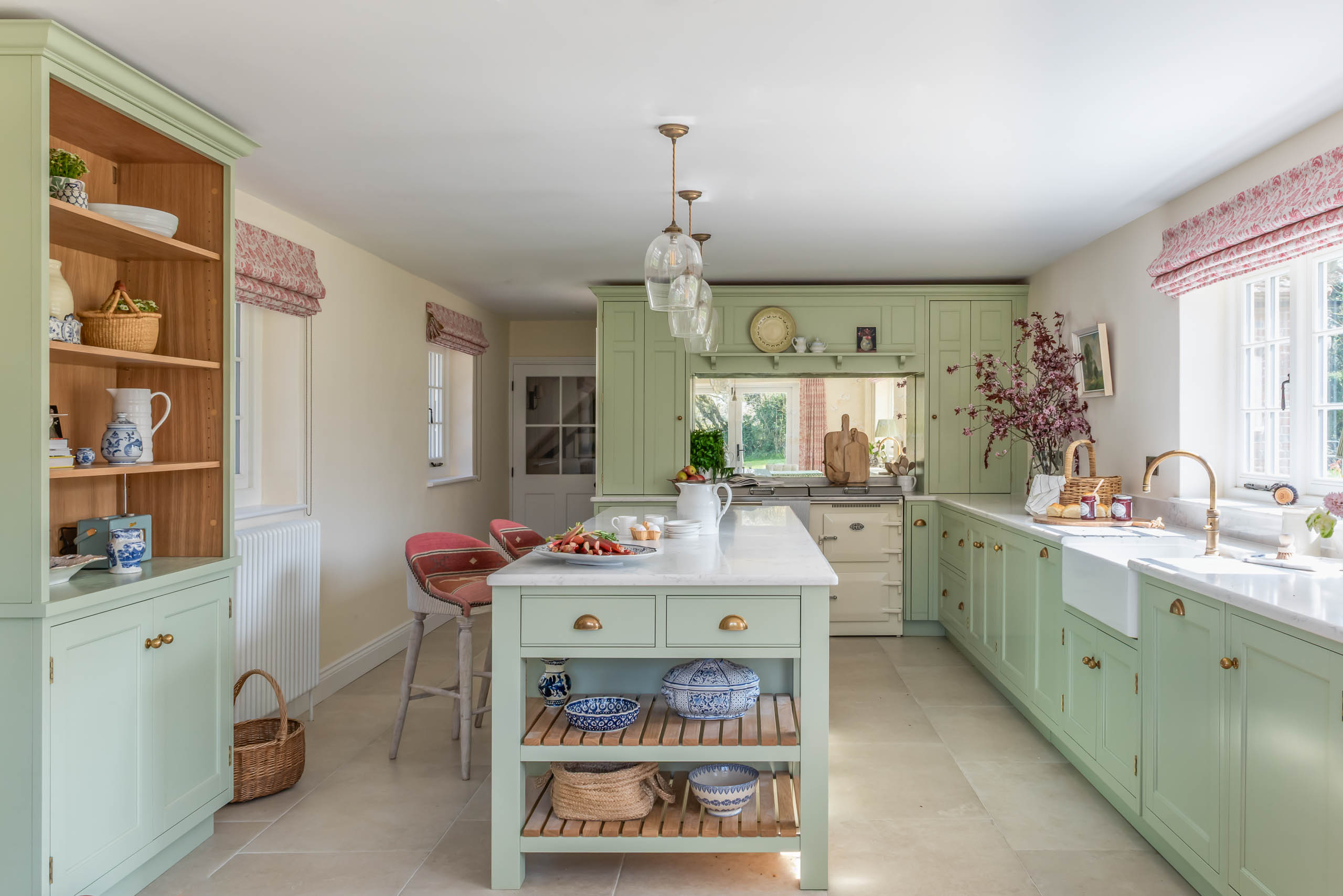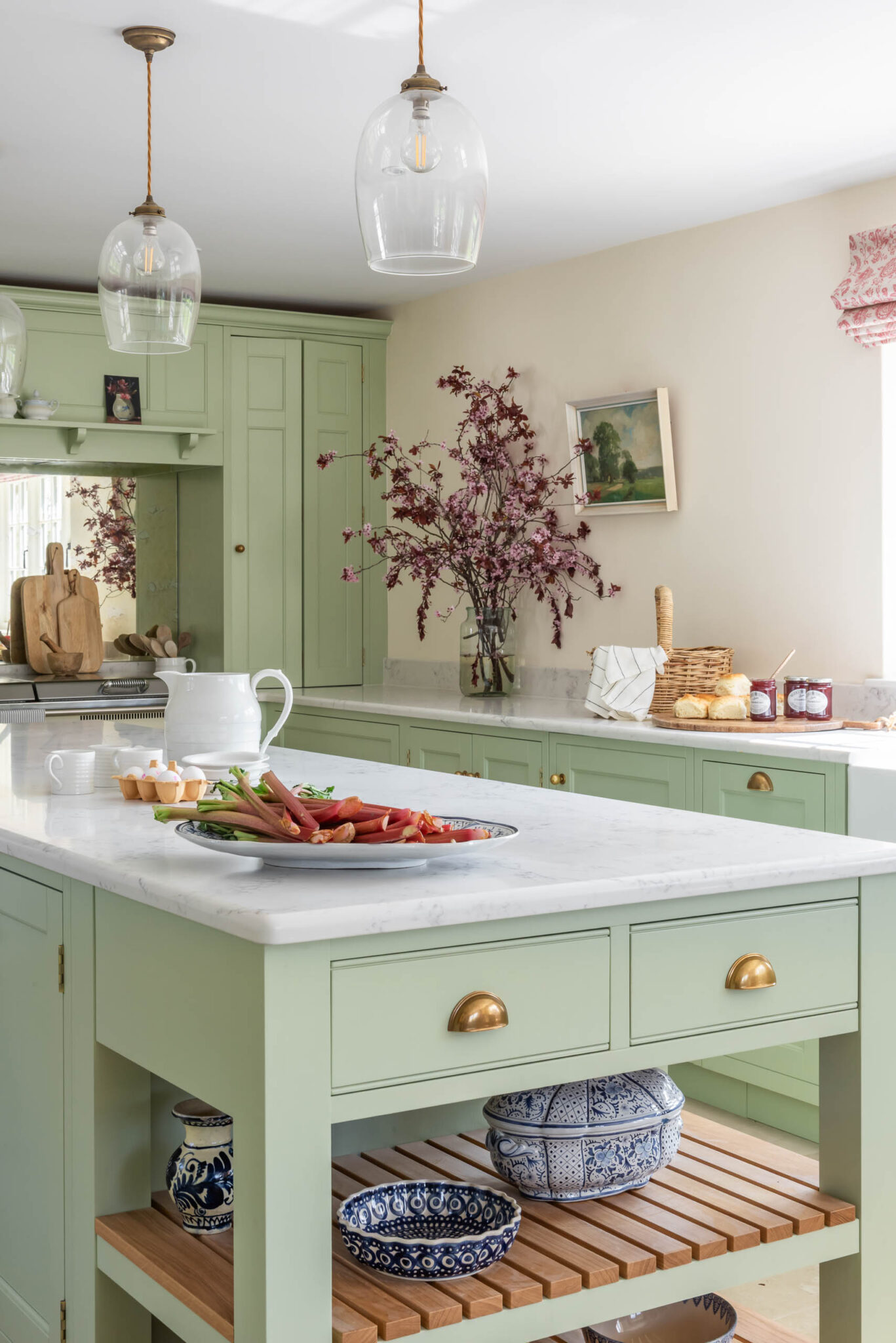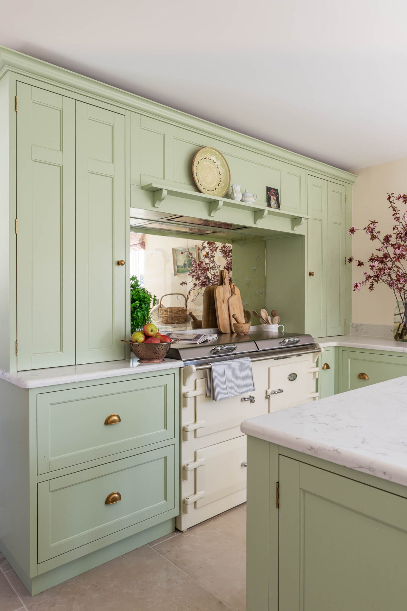 Tủ bếp Calm Sage tận dụng tối đa không gian với hệ tủ chữ L ôm sát tường, tạo ra các khu vực lưu trữ rộng lớn. Đảo bếp trung tâm được thiết kế như một chiếc bàn soạn đồ cổ điển với phần chân hở và nan gỗ thoáng bên dưới. Đây không chỉ là nơi sơ chế thực phẩm mà còn là điểm nhấn trang trí, nơi trưng bày những bộ gốm sứ sưu tầm đẹp mắt. Khu vực nấu nướng được thiết kế đặc biệt với hốc tường mô phỏng lò sưởi (Chimney breast), tạo nên một sân khấu trang trọng cho chiếc bếp Range Cooker cổ điển.