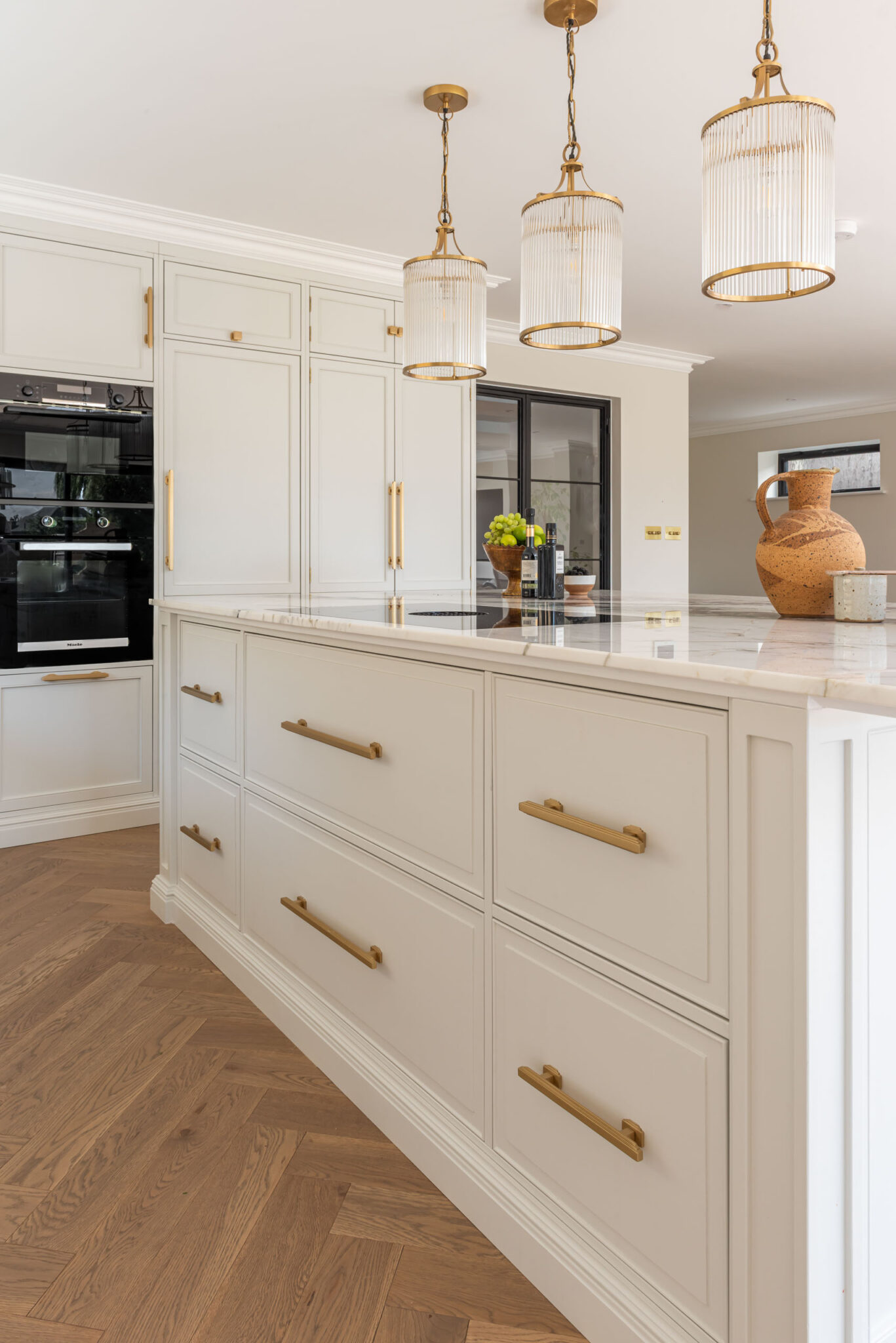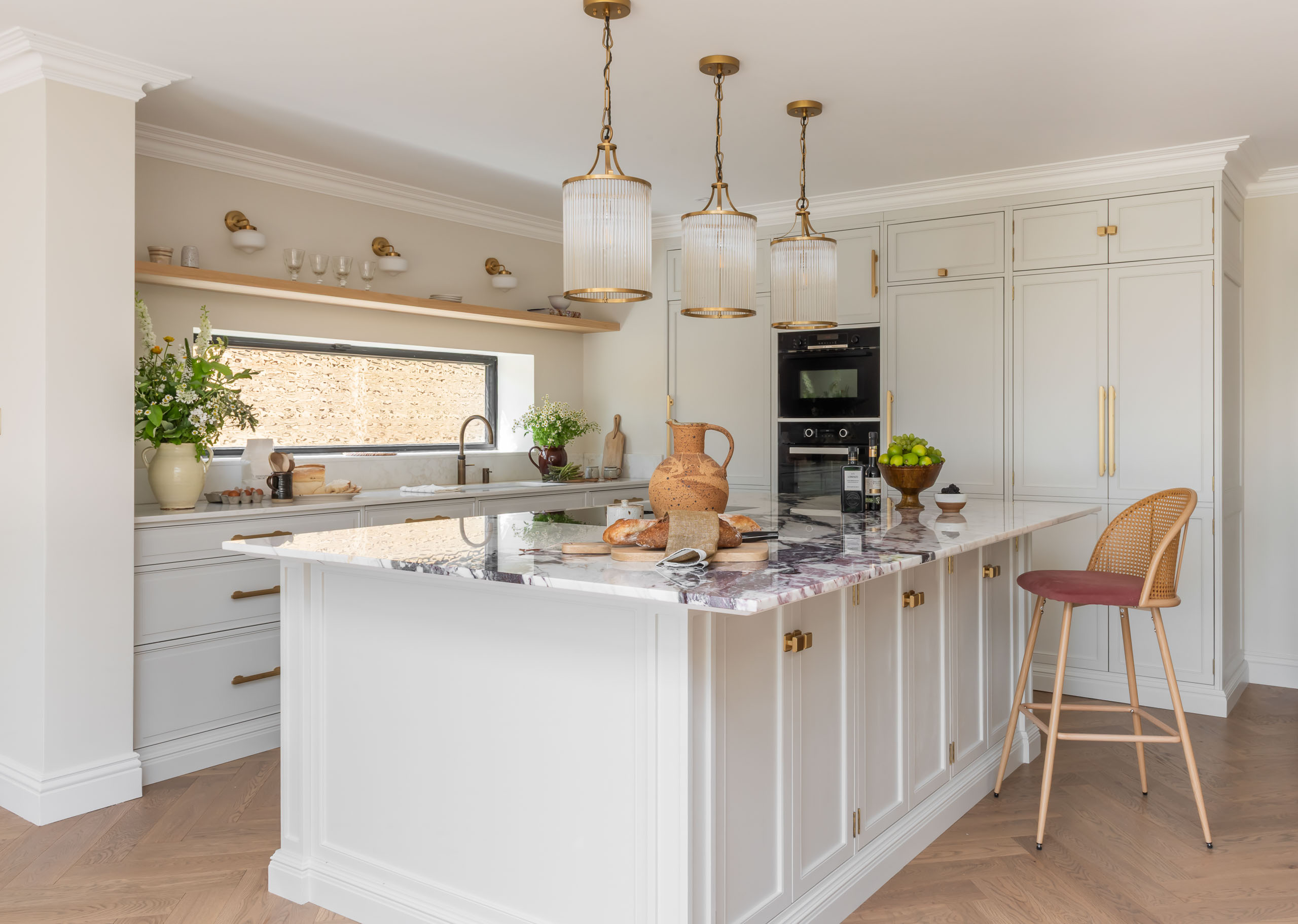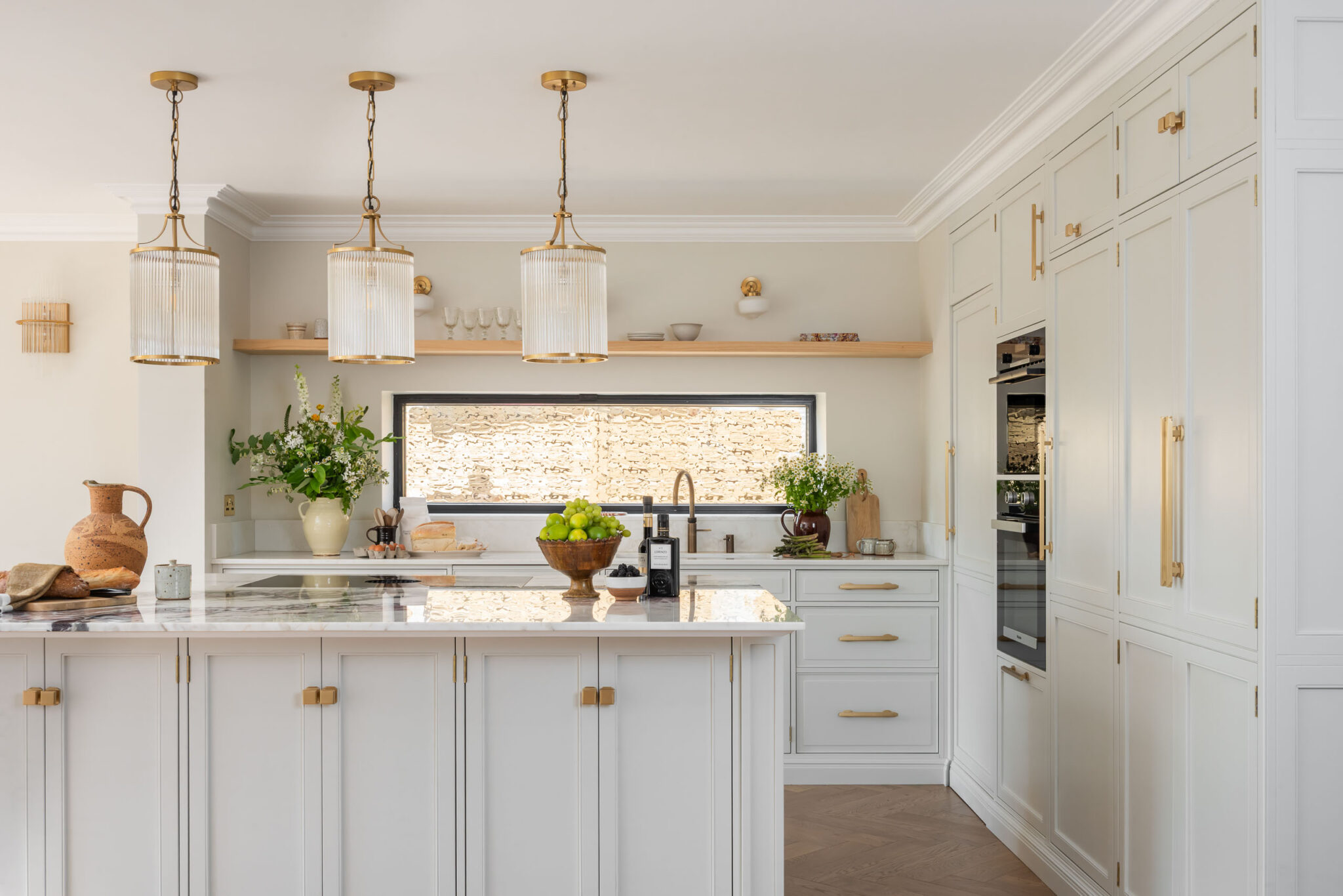 • Đèn thả trần thủy tinh (Fluted Glass Pendants): Hệ đèn thả với chao thủy tinh sọc dọc viền đồng tạo hiệu ứng ánh sáng lung linh, tôn vinh khu vực đảo bếp.