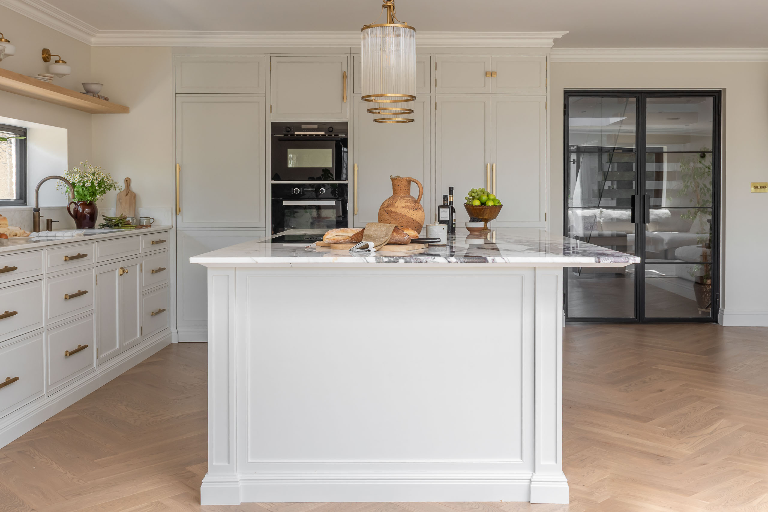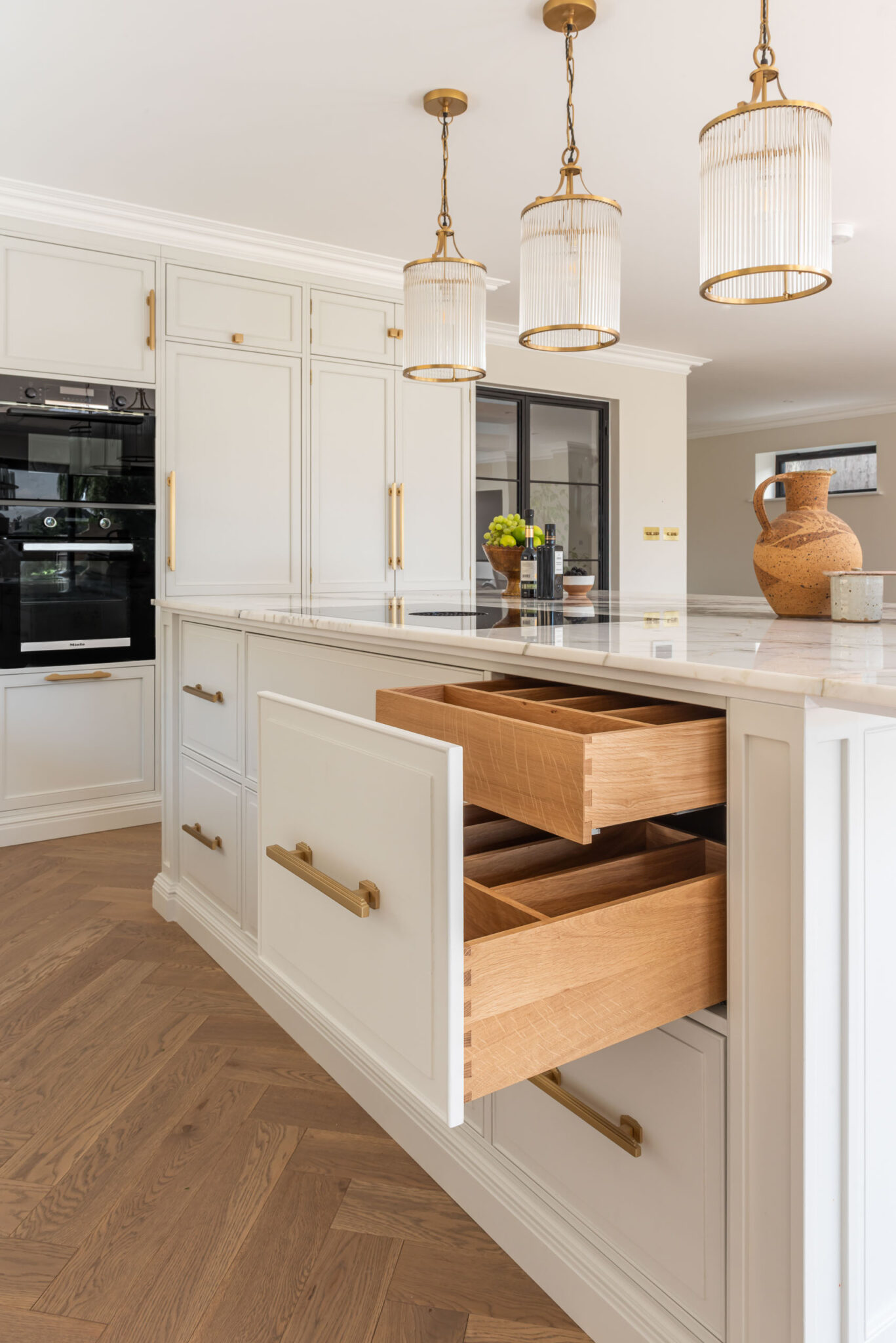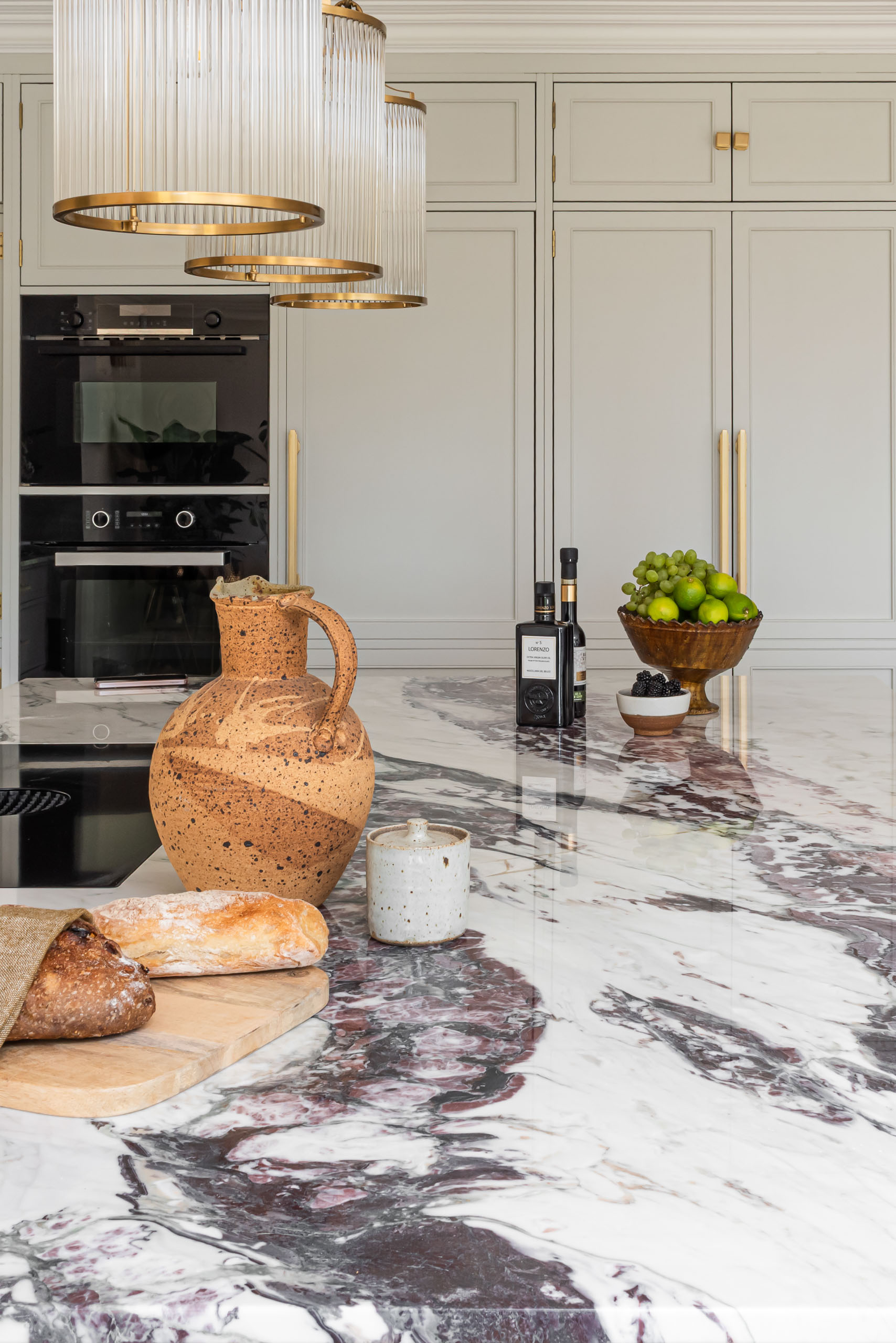 • Đèn thả trần thủy tinh (Fluted Glass Pendants): Hệ đèn thả với chao thủy tinh sọc dọc viền đồng tạo hiệu ứng ánh sáng lung linh, tôn vinh khu vực đảo bếp.
