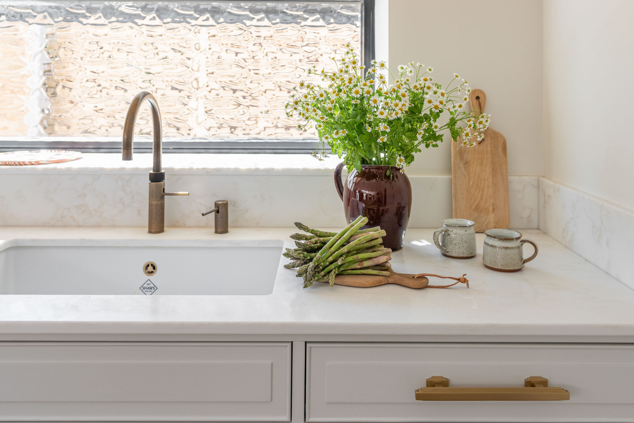 • Bồn rửa sứ đôi (Double Butler Sink): Chậu rửa sứ trắng mặt yếm sọc (fluted) đặc trưng của phong cách Farmhouse, vừa đẹp cổ điển vừa cực kỳ tiện dụng với lòng chậu sâu.
