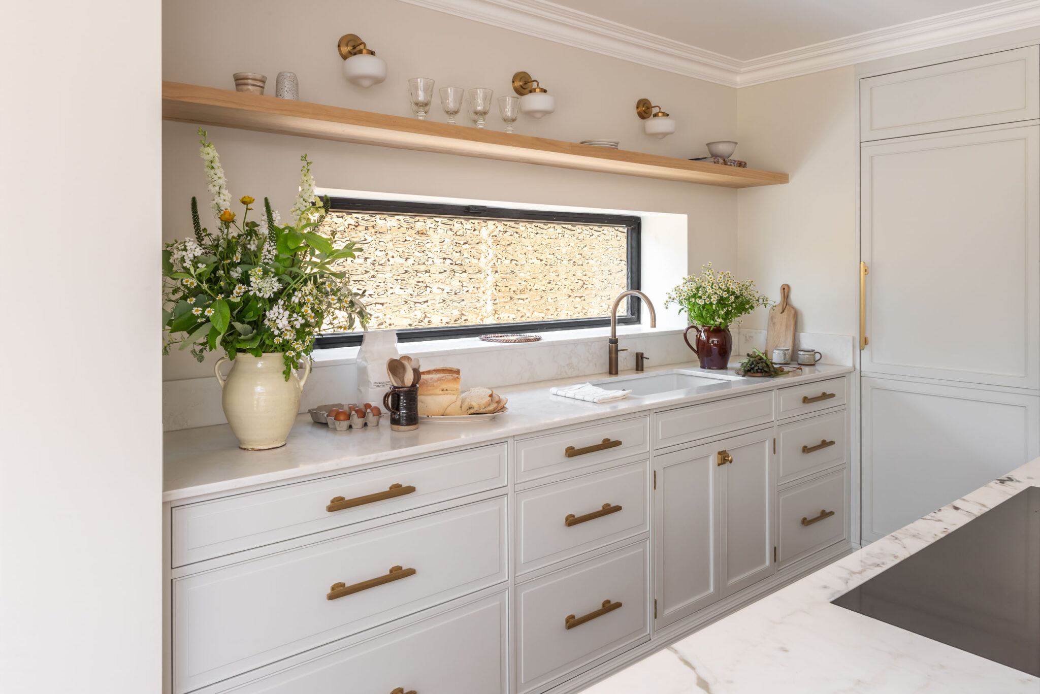 • Kệ mở với giá đỡ đồng (Open Shelving): Thay vì tủ treo kín mít, thiết kế sử dụng đợt kệ đá mỏng với giá đỡ cong bằng đồng, nơi trưng bày tranh ảnh và đồ gốm sưu tầm, giúp căn bếp trông nhẹ nhàng và “thơ” hơn.