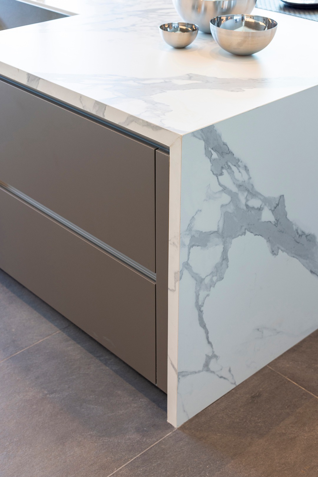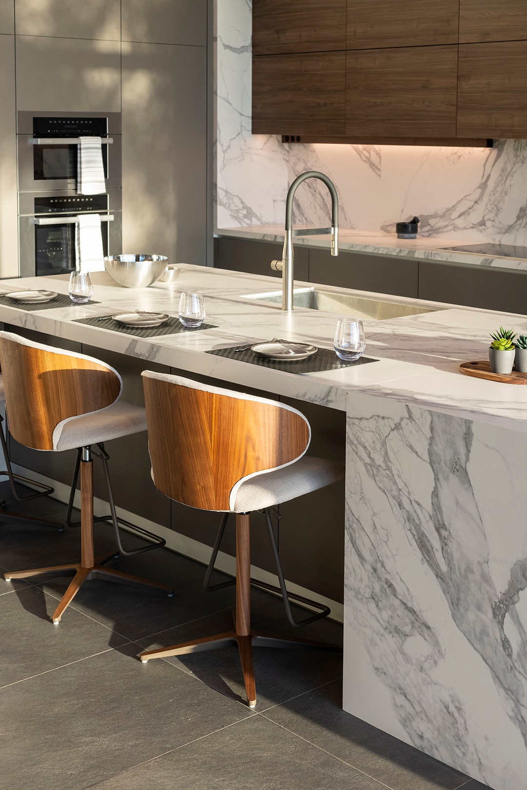 Đá Marble Waterfall (Đá thác nước): Chi tiết đắt giá nhất là mặt đá cẩm thạch trắng vân mây bao phủ toàn bộ đảo bếp và đổ tràn xuống hai bên hông (Waterfall edge). Kỹ thuật ghép vân (Bookmatch) tại các góc cạnh thể hiện sự tỉ mỉ và đẳng cấp thi công cực cao.