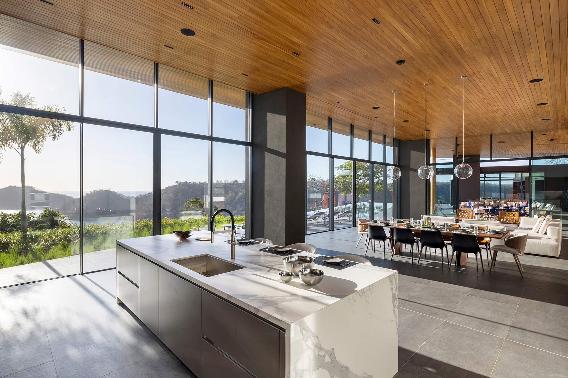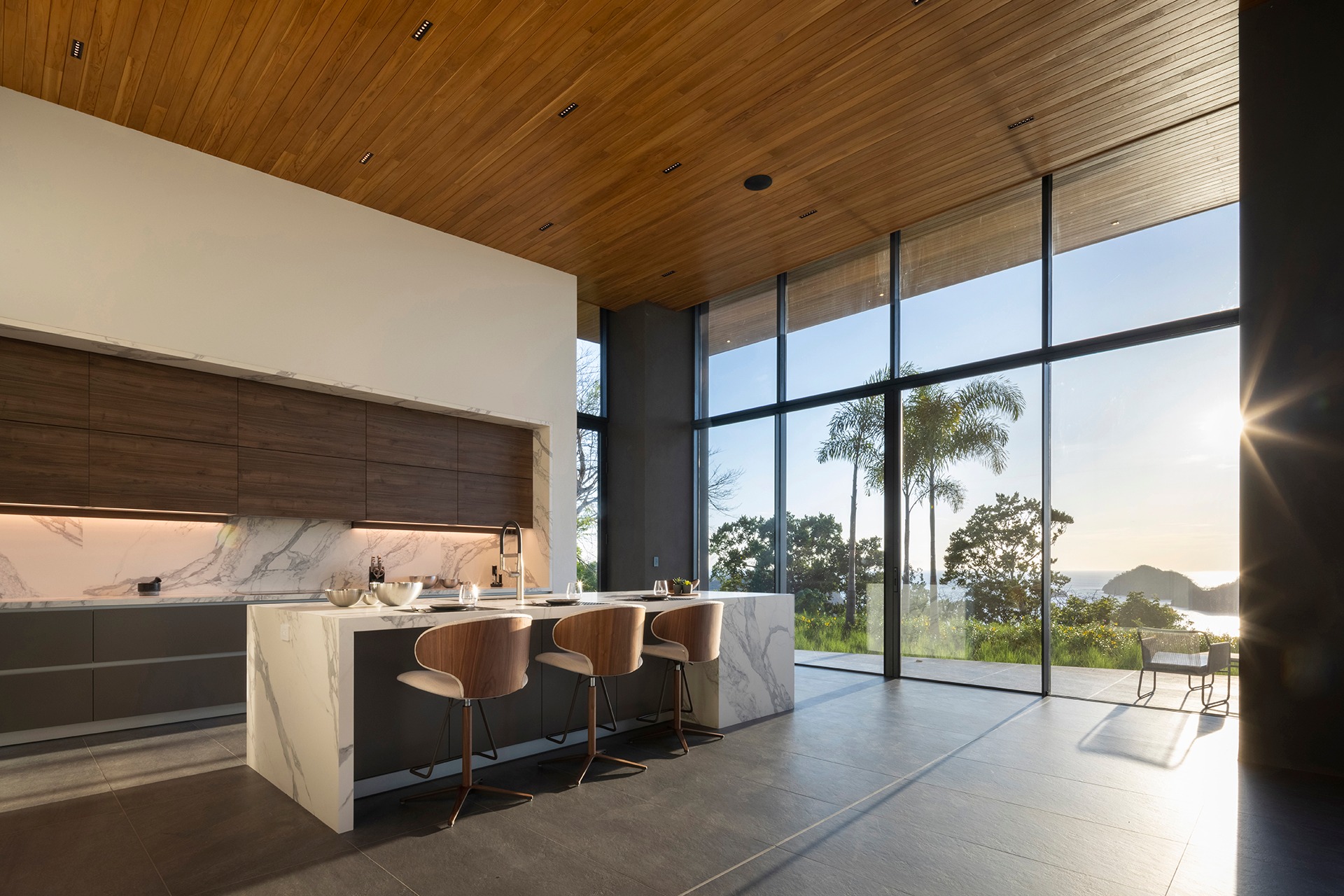 Tủ bếp Horizon Luxe là biểu tượng của phong cách Modern Tropical (Hiện đại Nhiệt đới), nơi ranh giới giữa nội thất và thiên nhiên bị xóa nhòa hoàn toàn. Thiết kế này không chỉ là một căn bếp, mà là một “đài quan sát” ẩm thực, nơi gia chủ vừa chế biến món ăn, vừa thưởng ngoạn bức tranh phong cảnh hùng vĩ bên ngoài khung cửa kính kịch trần.