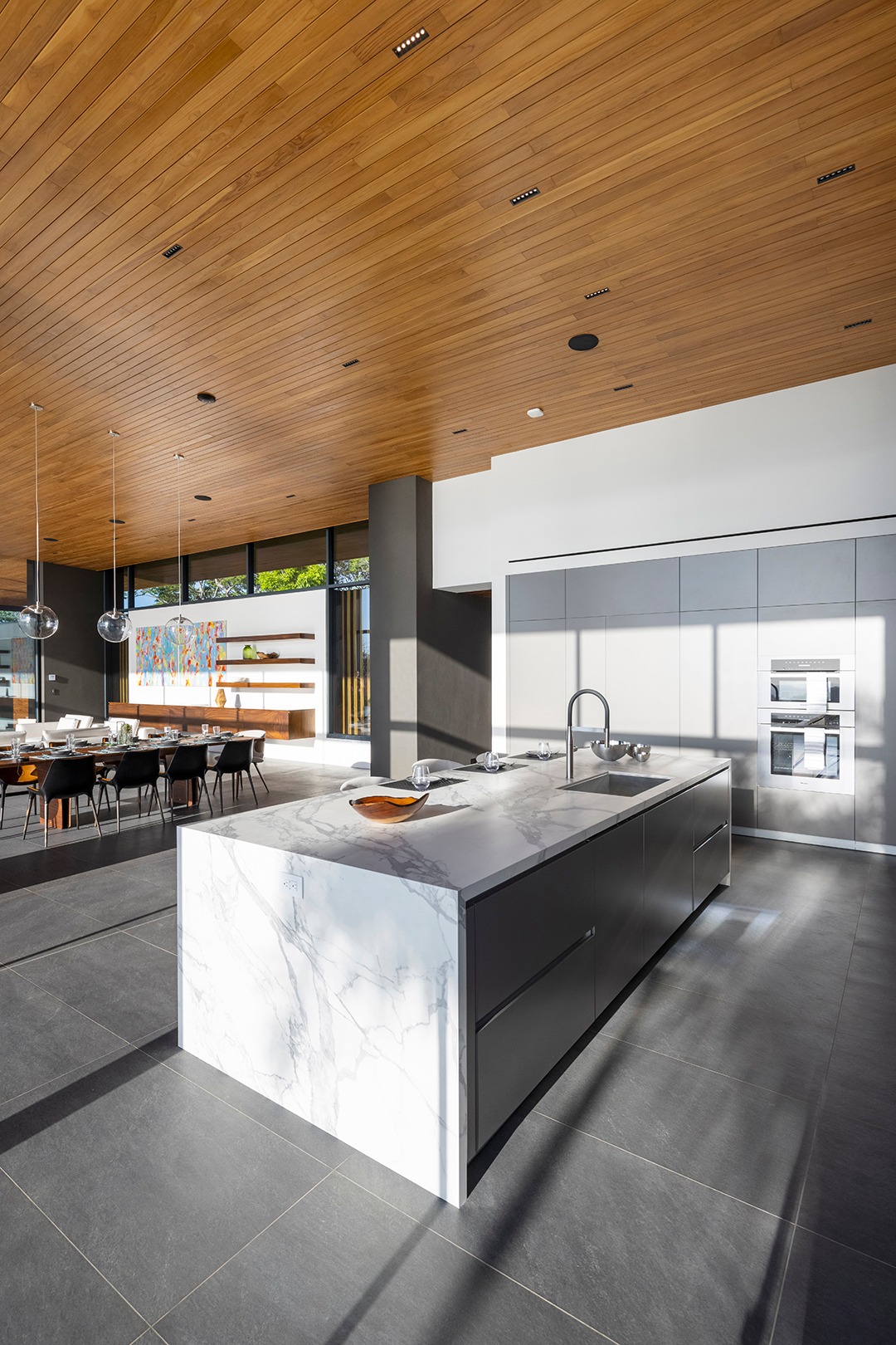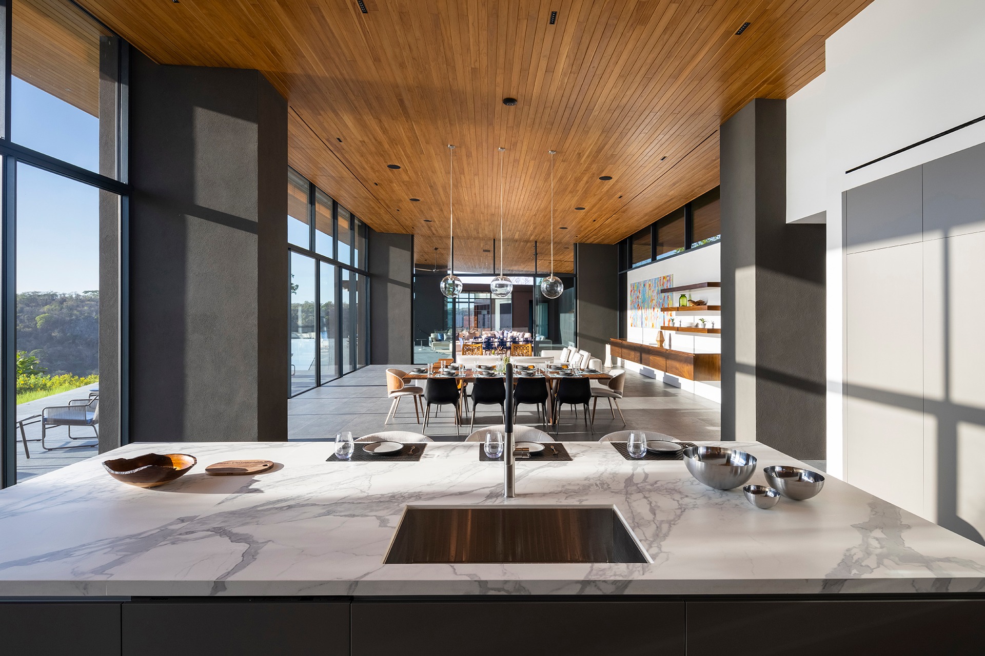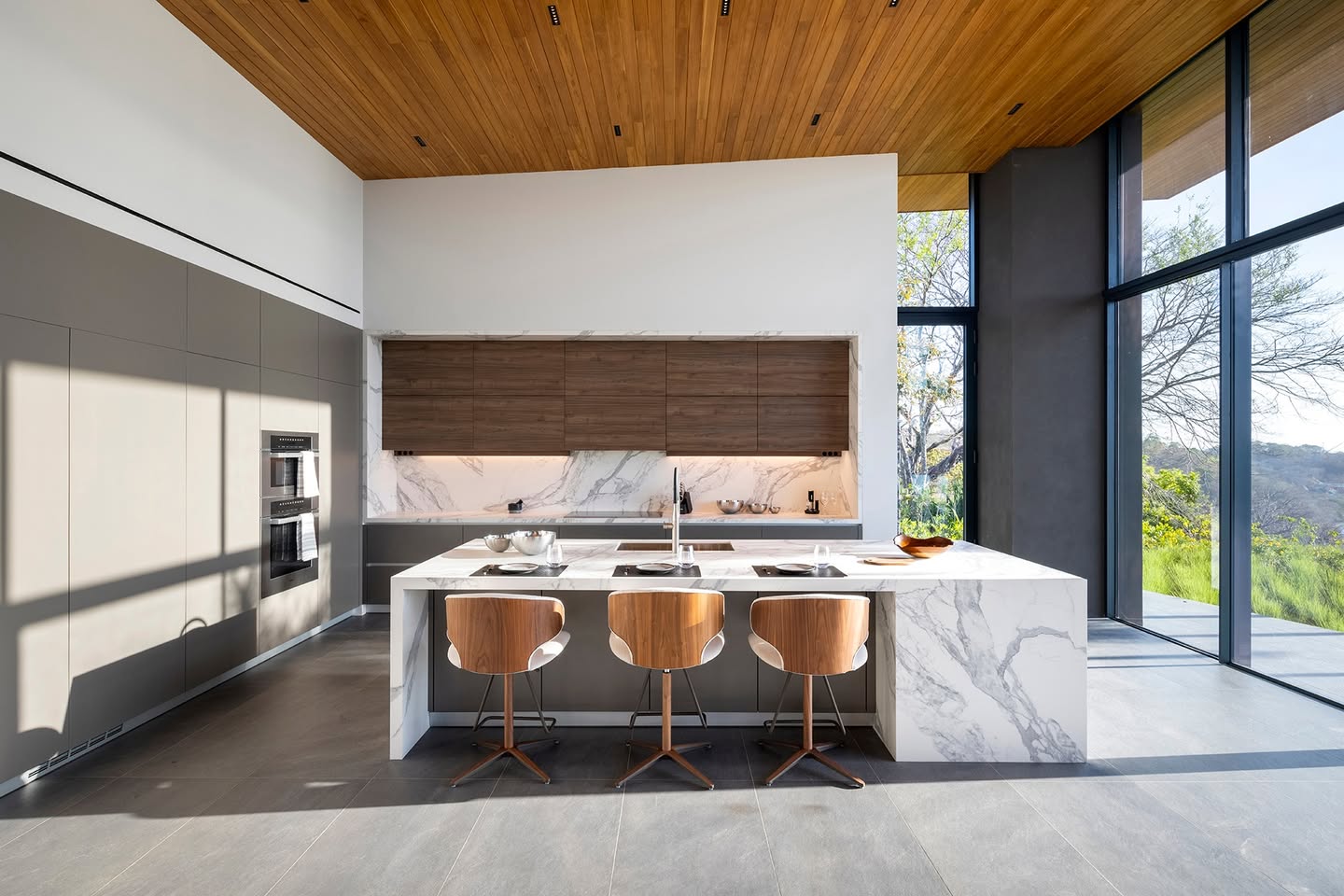 Khác với sự cầu kỳ của cổ điển, Horizon Luxe chinh phục thị giác bằng những đường thẳng sắc sảo (Clean lines) và sự tương phản vật liệu đầy nghệ thuật. Sự kết hợp giữa Trần gỗ Teak ấm áp, Sàn đá xám mát lạnh và Đảo bếp Marble trắng tạo nên một bản giao hưởng không gian vừa phóng khoáng, vừa vững chãi.