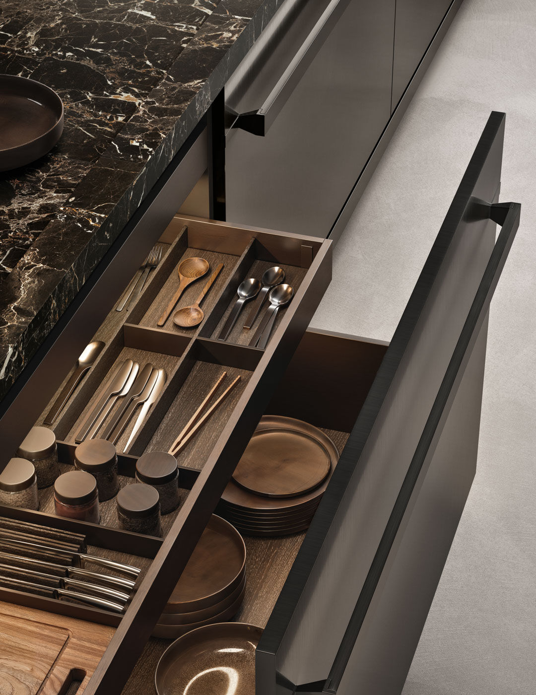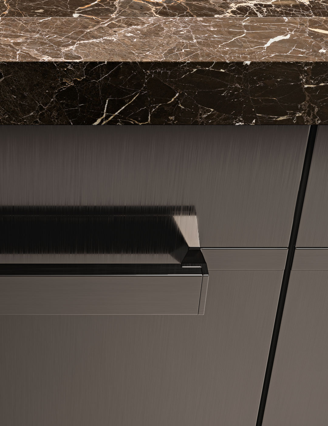 Tay nắm âm (Gola Profile): Thiết kế hoàn toàn không tay nắm lồi, sử dụng khe rãnh âm màu đen hoặc cùng màu tủ, giúp bề mặt phẳng phiu tuyệt đối.