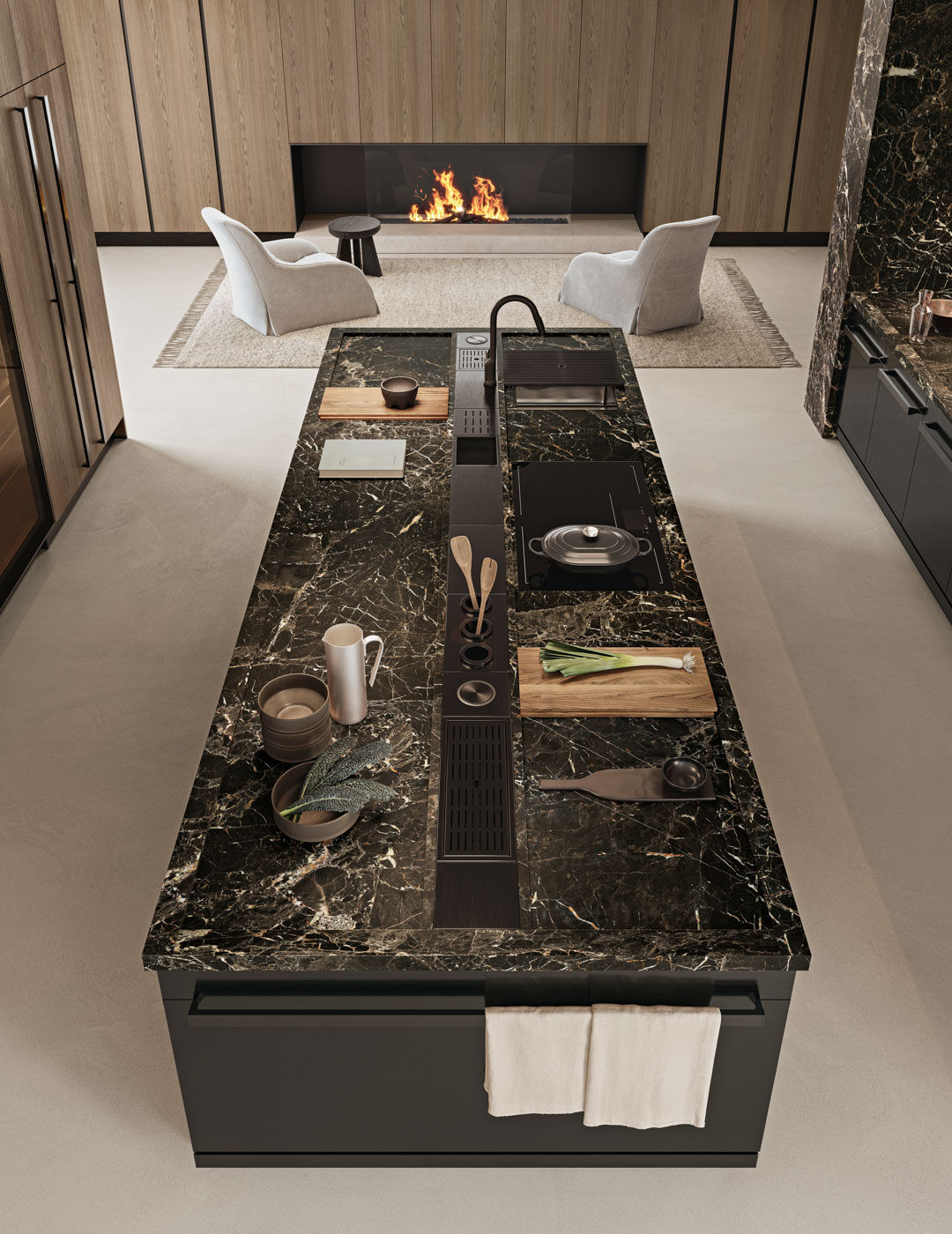 Điểm nhấn Đen Mờ (Matte Black): Vòi rửa, khe tay nắm âm và viền bếp từ màu đen tạo nên những nét kẻ mảnh, sắc sảo, định hình khối tích rõ ràng.