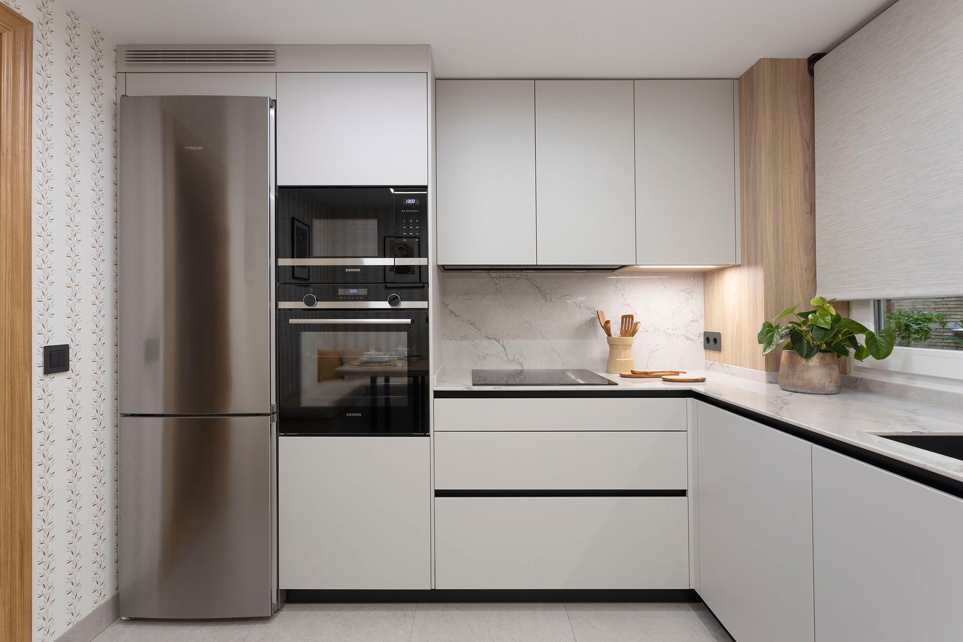 • Thiết bị âm tủ đồng bộ: Tủ lạnh, lò nướng, lò vi sóng được tích hợp hoàn hảo vào hệ tủ gỗ, tạo nên một mặt phẳng liền mạch, hiện đại và vô cùng ngăn nắp.