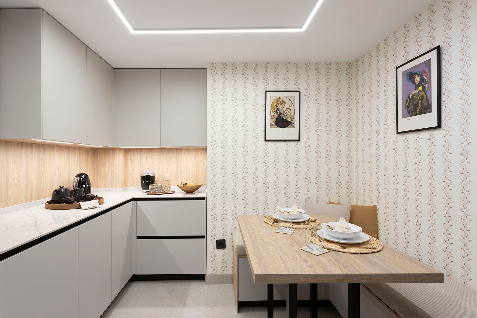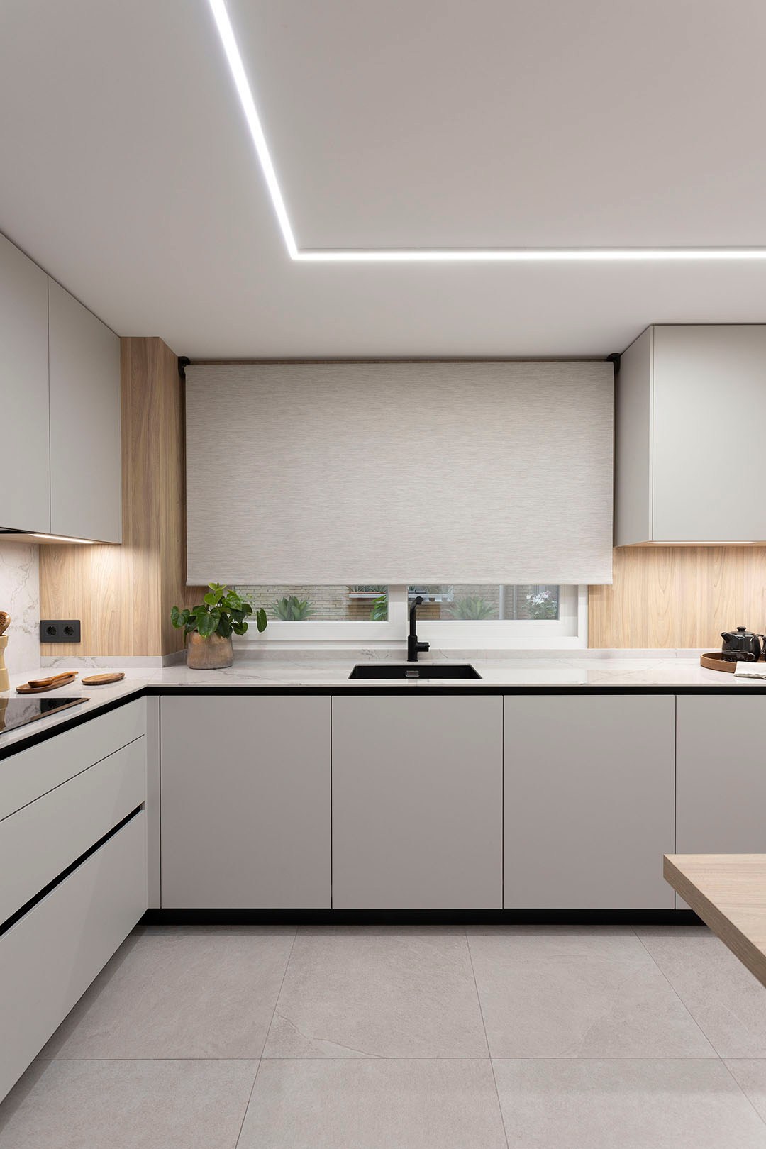 Sự tinh tế của gian bếp nằm ở cách kết hợp hài hòa giữa các dải màu và chất liệu: