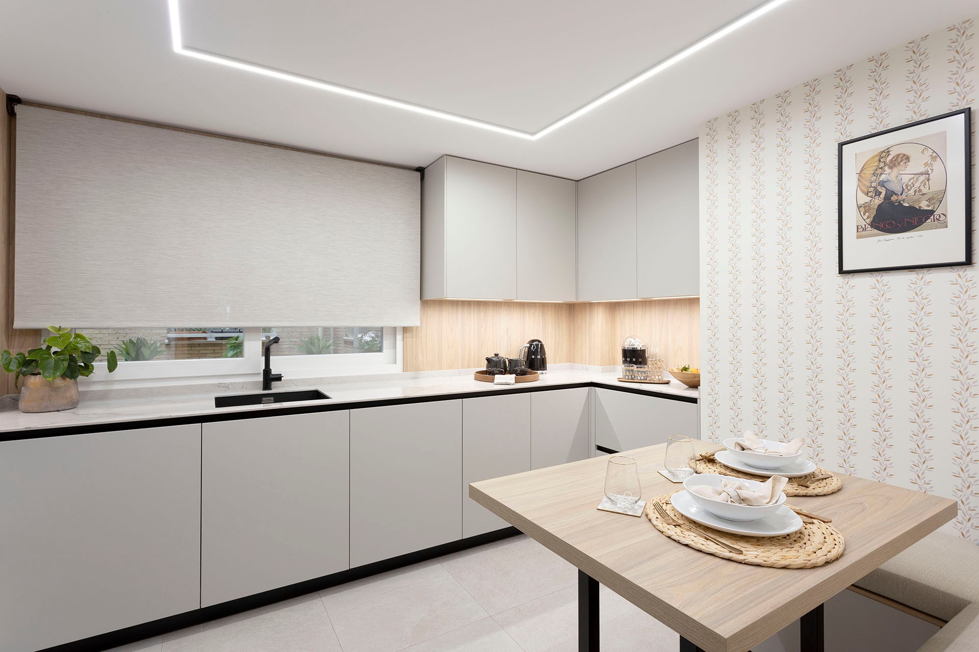 • Tủ bếp được thiết kế vừa vặn với mặt bằng hiện và hài hoà với tổng thể không gian. Không chỉ tối ưu công năng và lưu trữ mà còn giúp bếp luôn gọn gàng và thẩm mỹ.